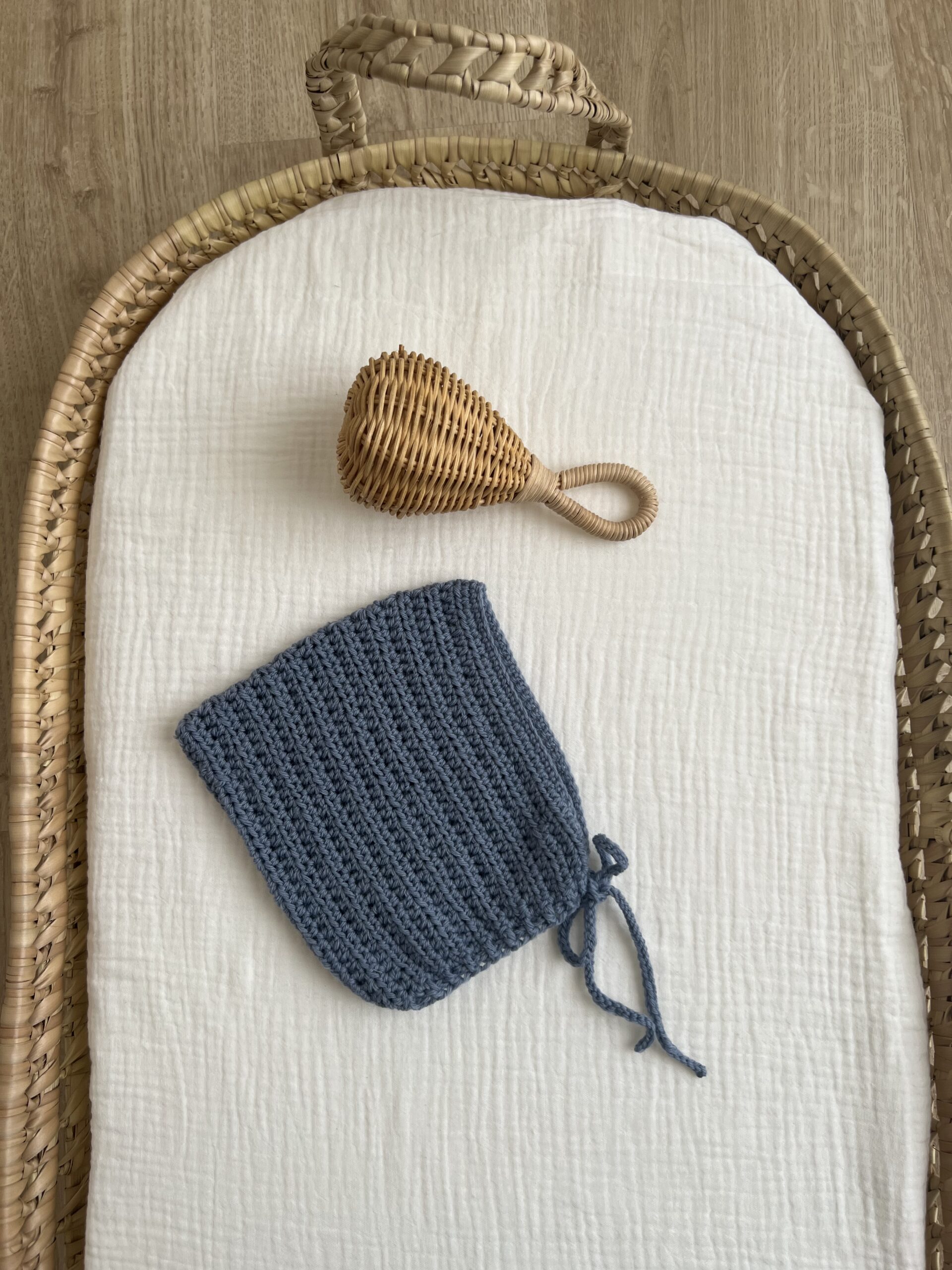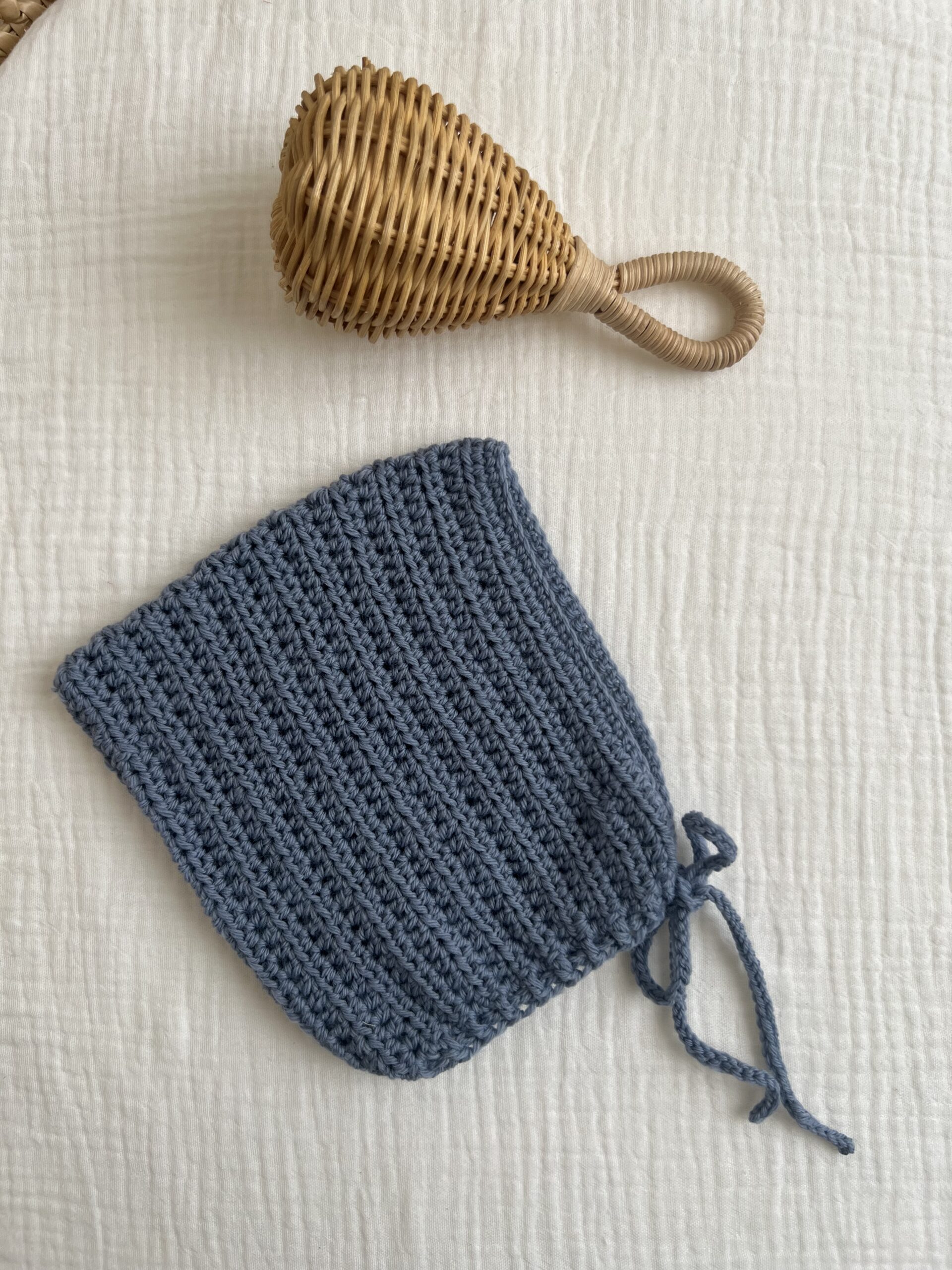 Capota tipo gnomo tejida en lana merino 100% en tono azul empolvado. Con lazada en la misma lana.