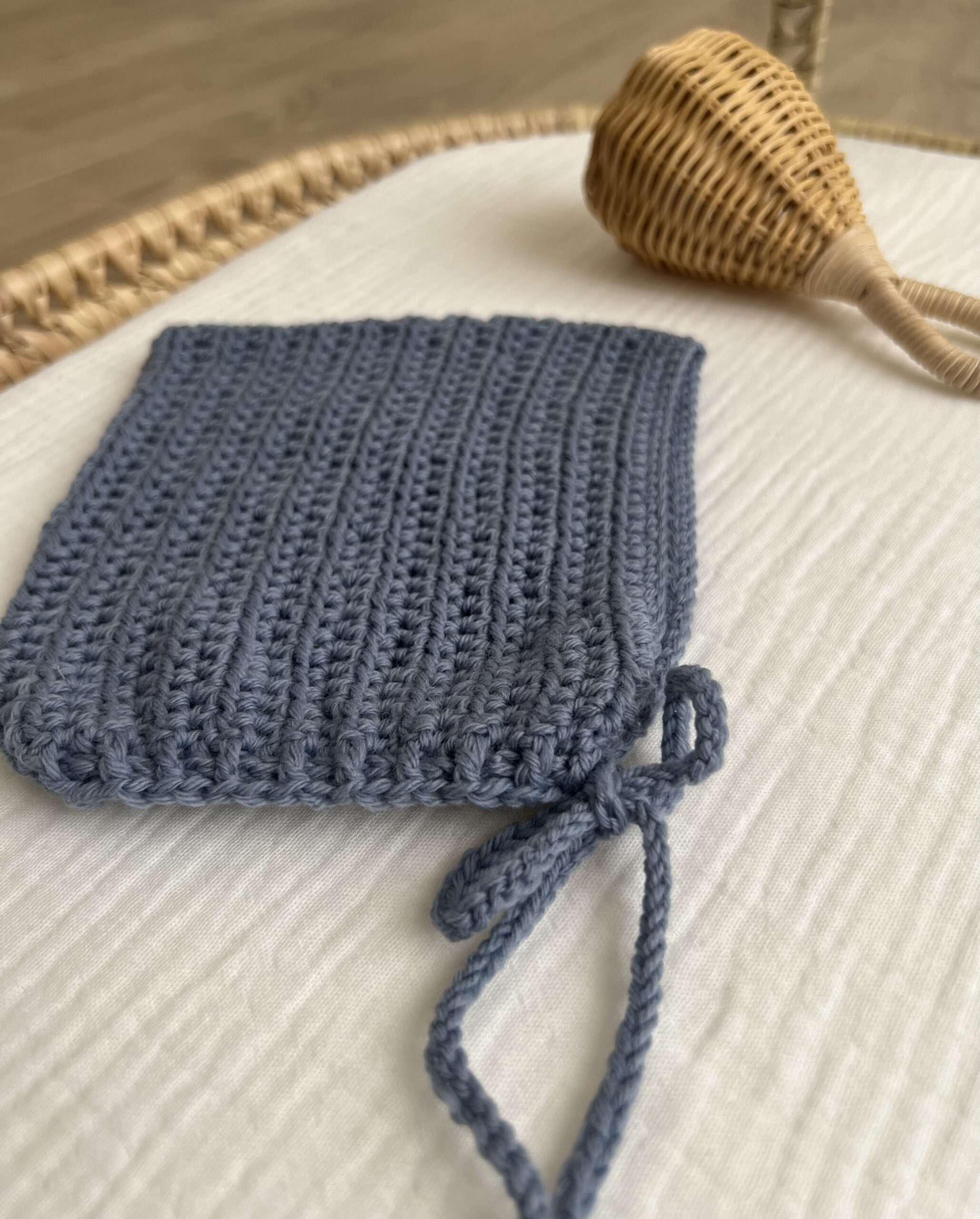 Capota tipo gnomo tejida a mano en lana merino 100% azul empolvado. Con lazada. Suave, cálida y muy especial.