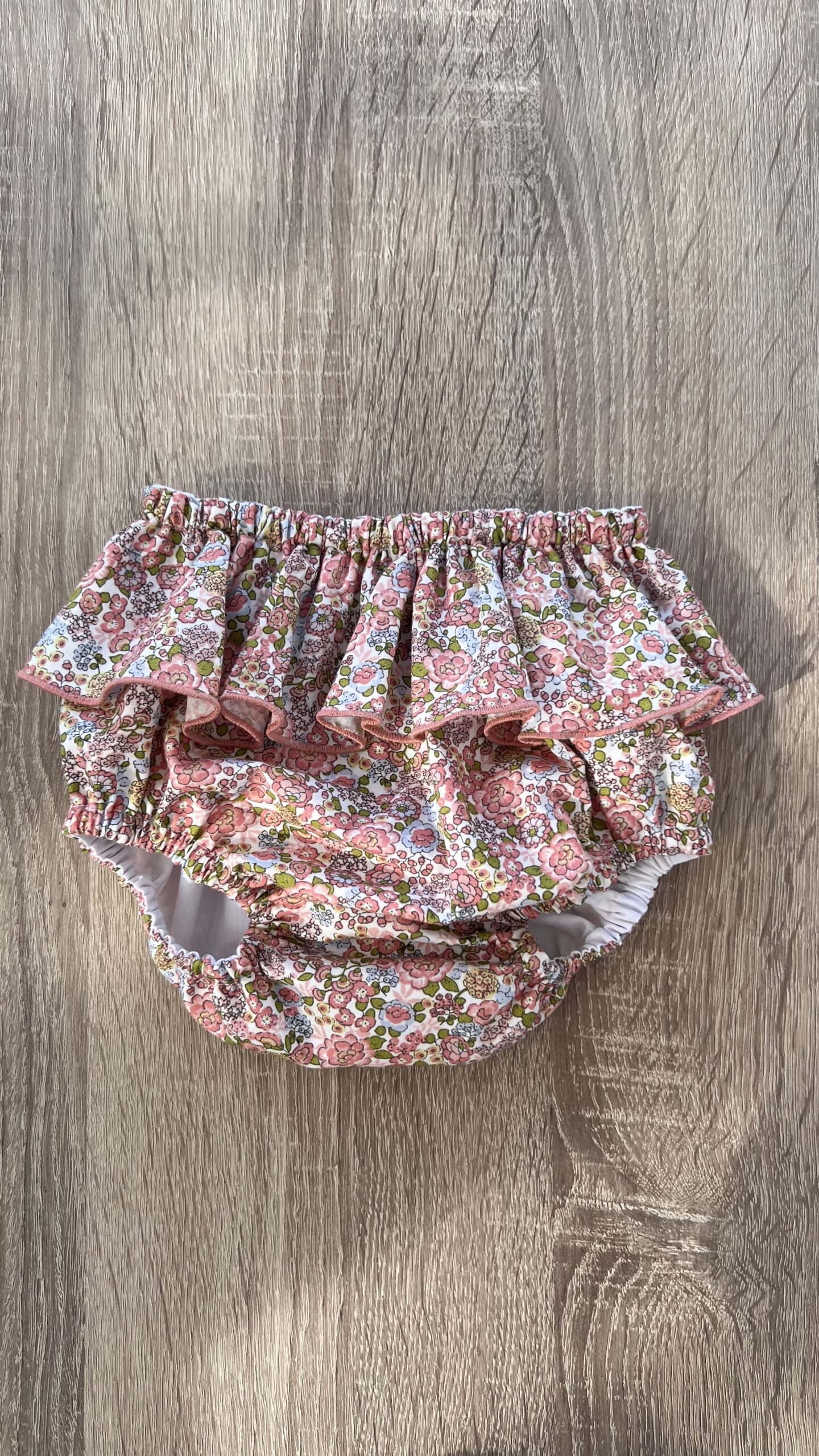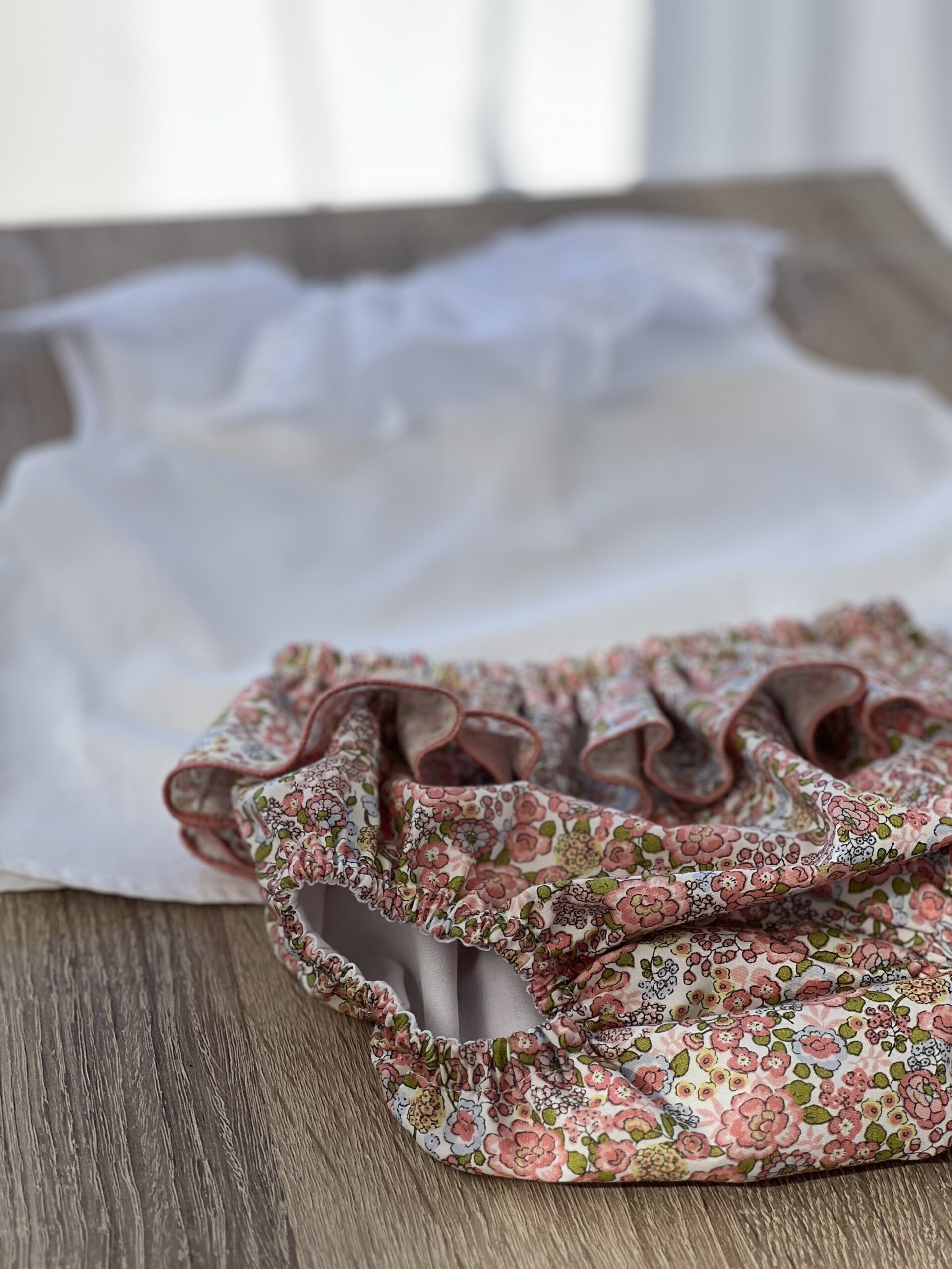 Cubrepañal con volante. Confeccionado en popelín de flores rosas. El volante lleva un repulgo en el borde en rosa a tono con las flores del estampado. Lleva elásticos en la cintura y piernas, son muy suaves y no aprietan.